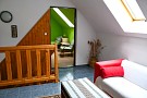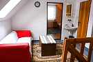 Na poddaszu domku znajdują się dwa pokoje 3-osobowe, sofa z telewizorem, toaleta i umywalka.
